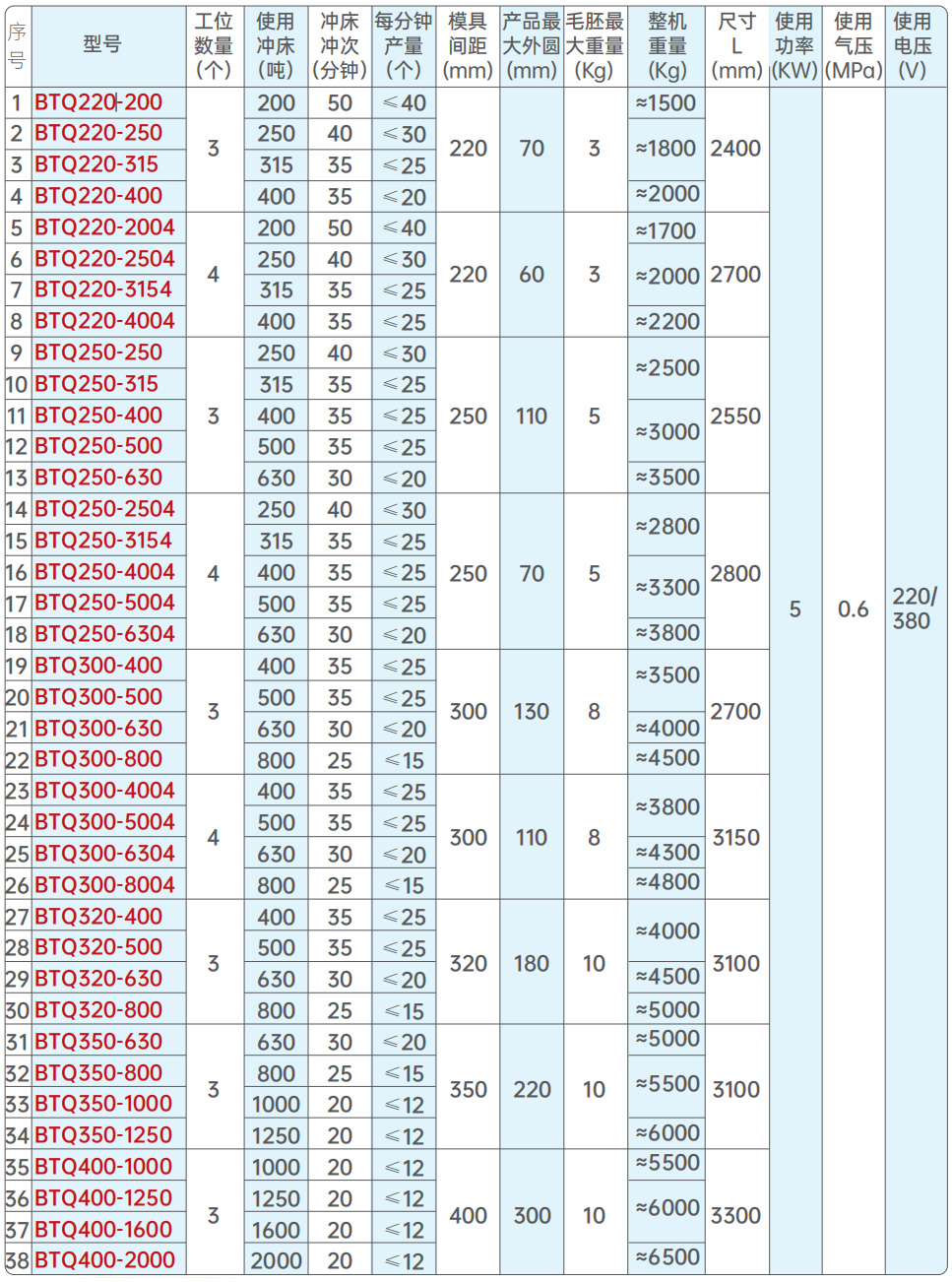 注3: 如果生產(chǎn)的產(chǎn)品是六角帽,可用六角的對角來選型。選型時先選擇沖床噸位,再按最大產(chǎn)品外圓來選擇步距,型號可以是上表中沒有的型號,比如BTQ220-500, BTQ350-1600。